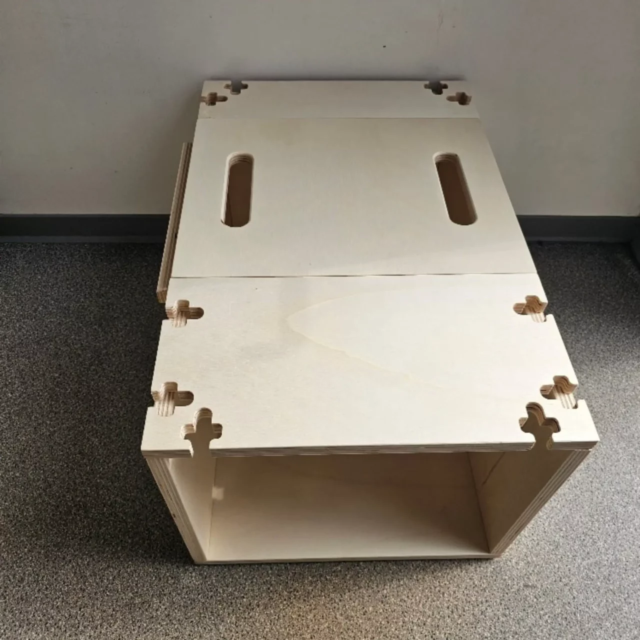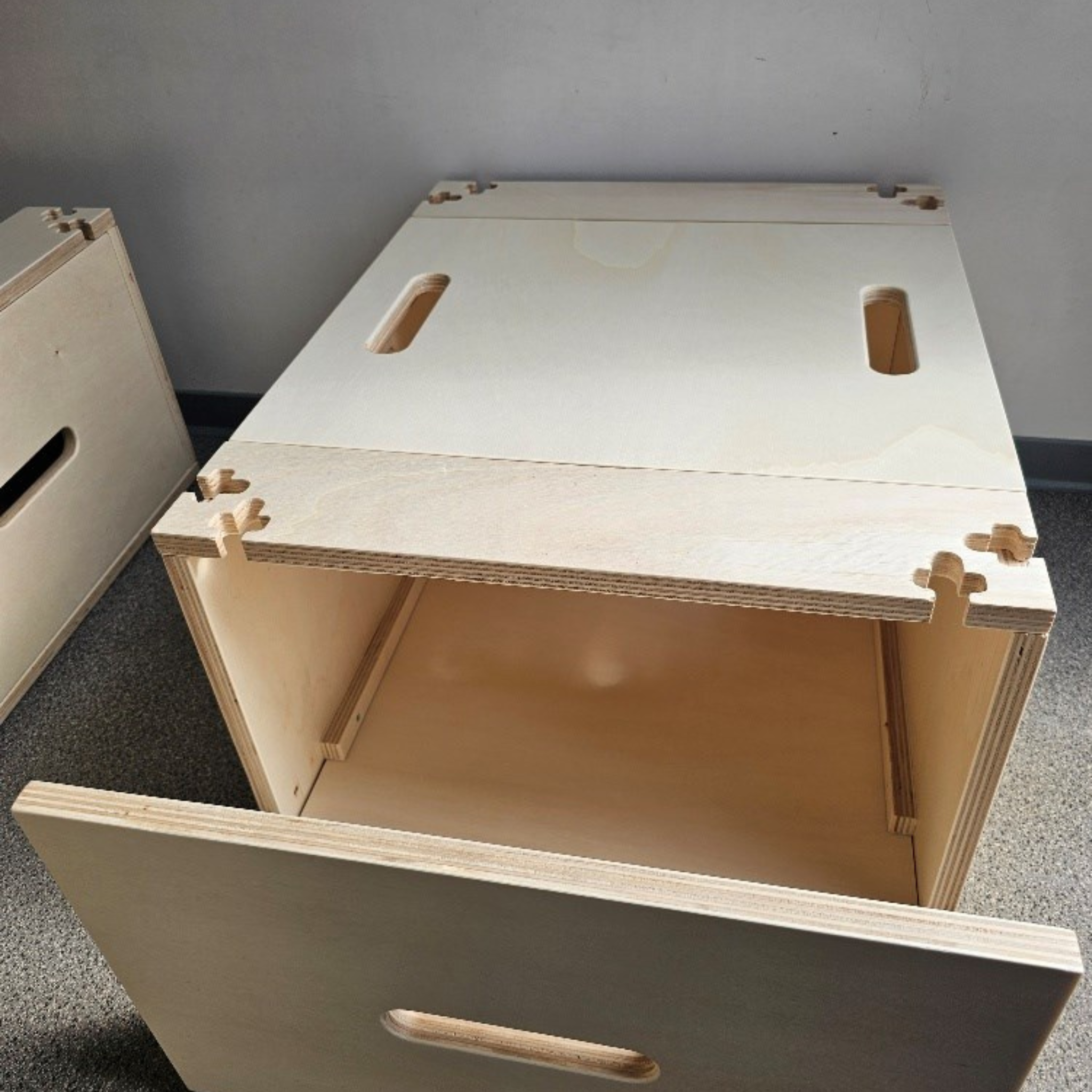 Caisson ouvert sur un côté de 60. Il est réversible. Sur le modèle exposé nous avons mis le côté ouvert vers l’intérieur du véhicule. Ce caisson permet le placement d’un frigo à compression.