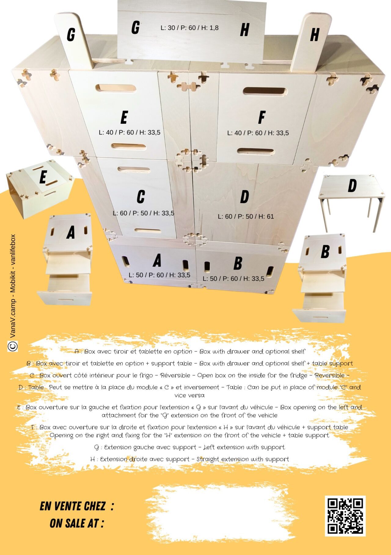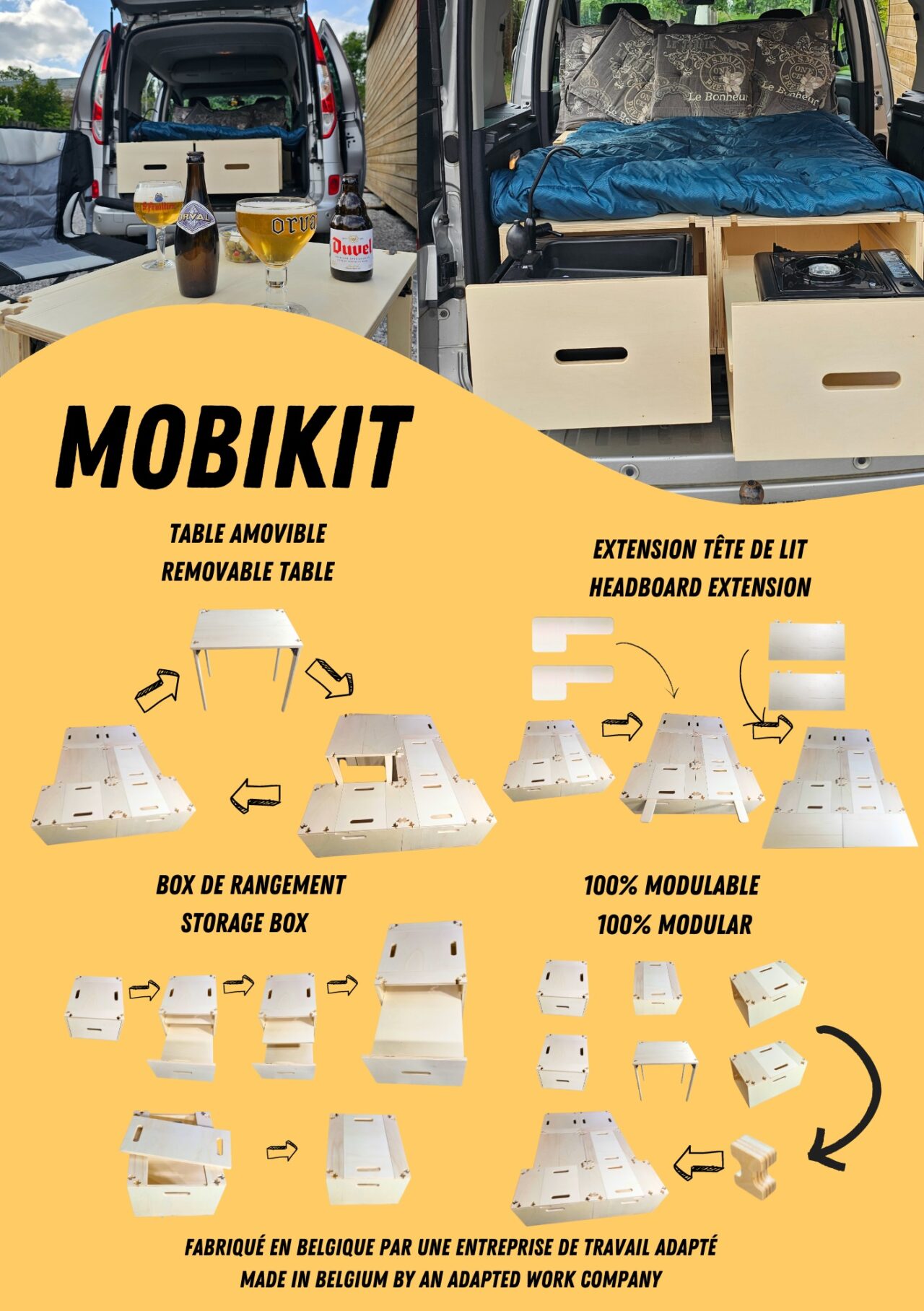 Le MobiKit est un kit d’aménagement modulaire qui s’adapte à plus de 300 modèles de véhicules. Il peut être configuré pour accueillir 1 ou 2 personnes, avec des modules vendus séparément et adaptables à différents véhicules. Ces modules sont fabriqués en peuplier de 18 mm, un bois durable et léger.